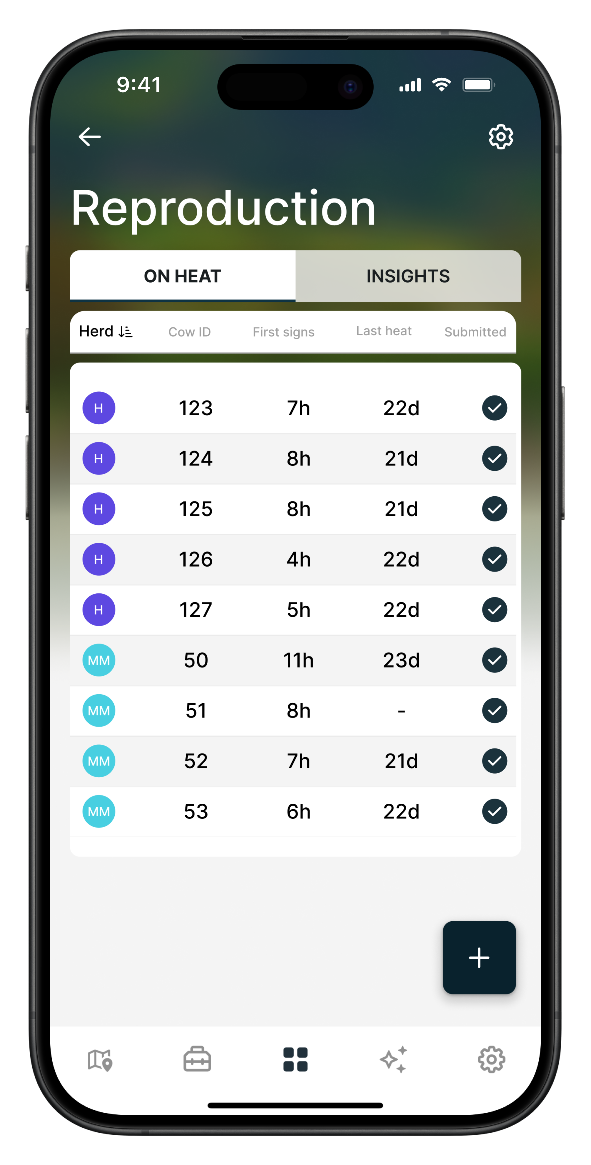 See every cow currently on heat in one organised list. Track first signs of heat, when they were last in heat, and mark cows as submitted for insemination — all from your phone.
